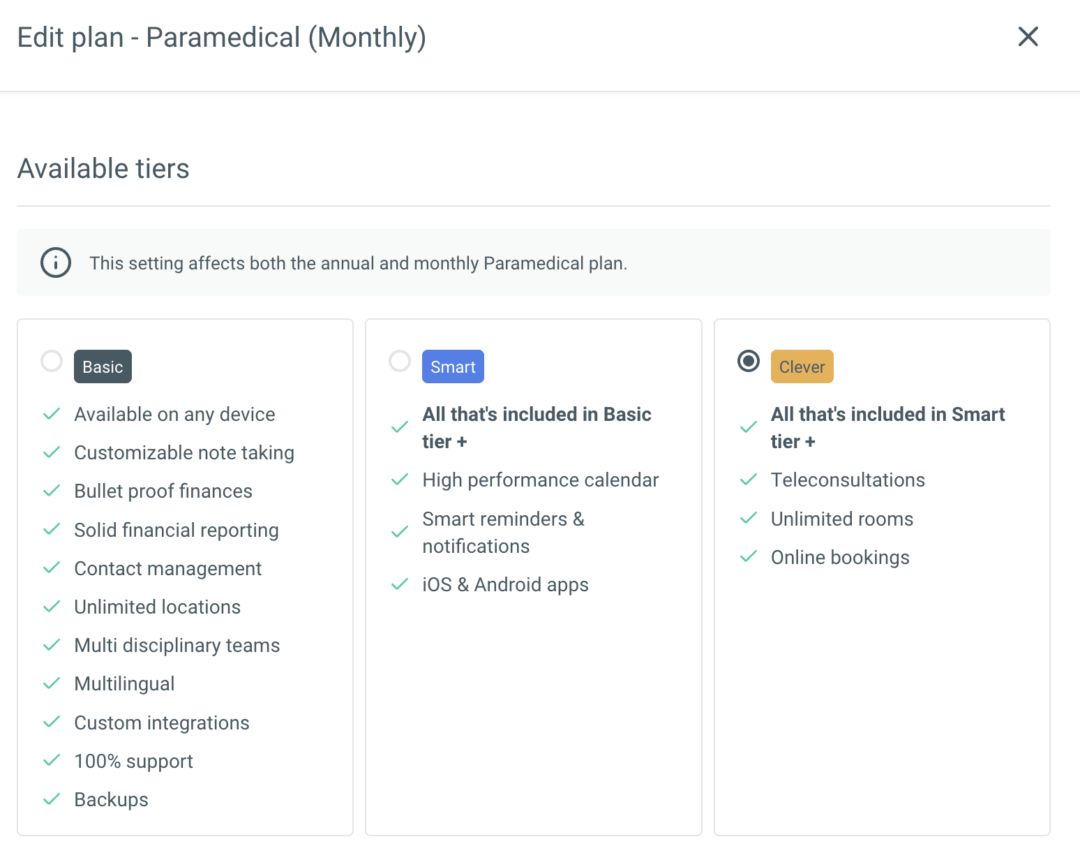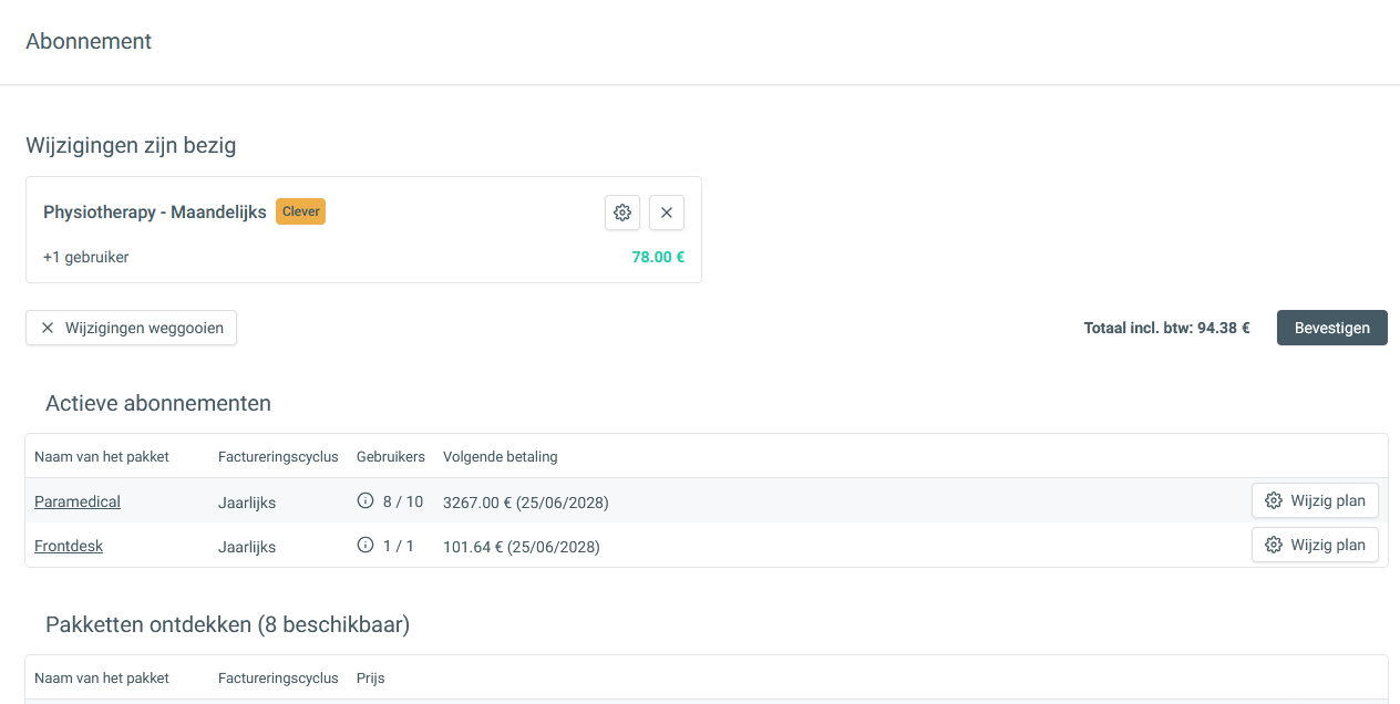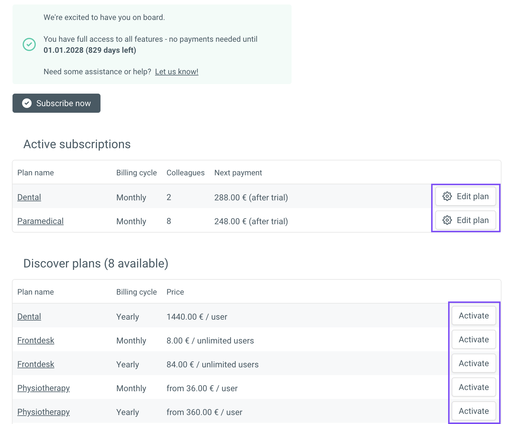 Click on [Modify plan] in the overview of current plans or click on [Activate] at the bottom, next to the desired plan, to add a new one.