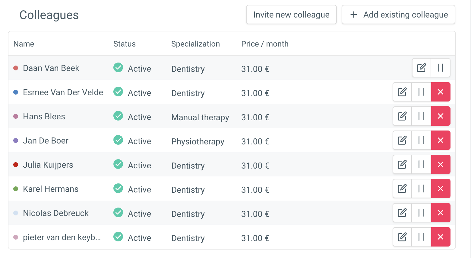 At the bottom, you can modify users. Add new users via [Invite a new user] or add existing users via [Add existing user]. To temporarily deactivate a colleague, click the pause button [||]. To remove a colleague from the plan, use the [X] button.