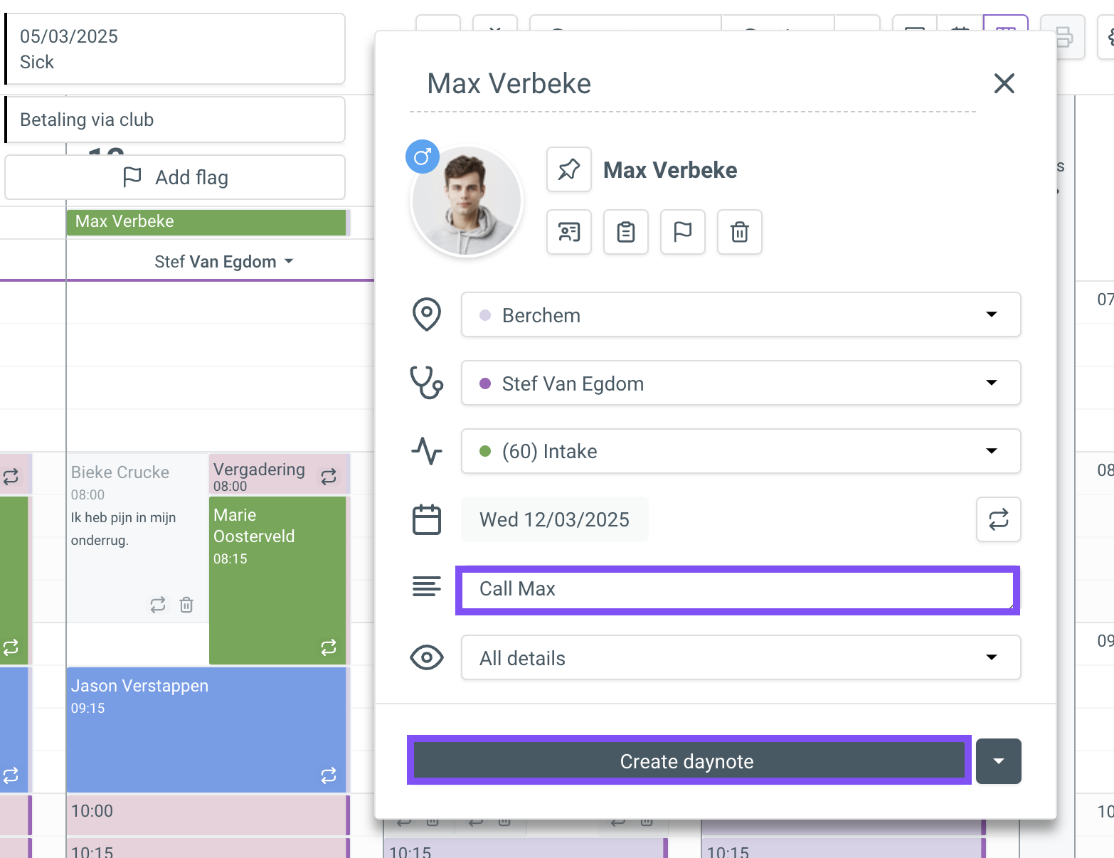 In the daynote bubble, fill in the desired information and click [Create Daynote] at the bottom. If the daynote relates to a patient, link it by searching for the patient or choosing the pinned patient. If the daynote is a message for that day, type the message as a title instead of linking a patient.
