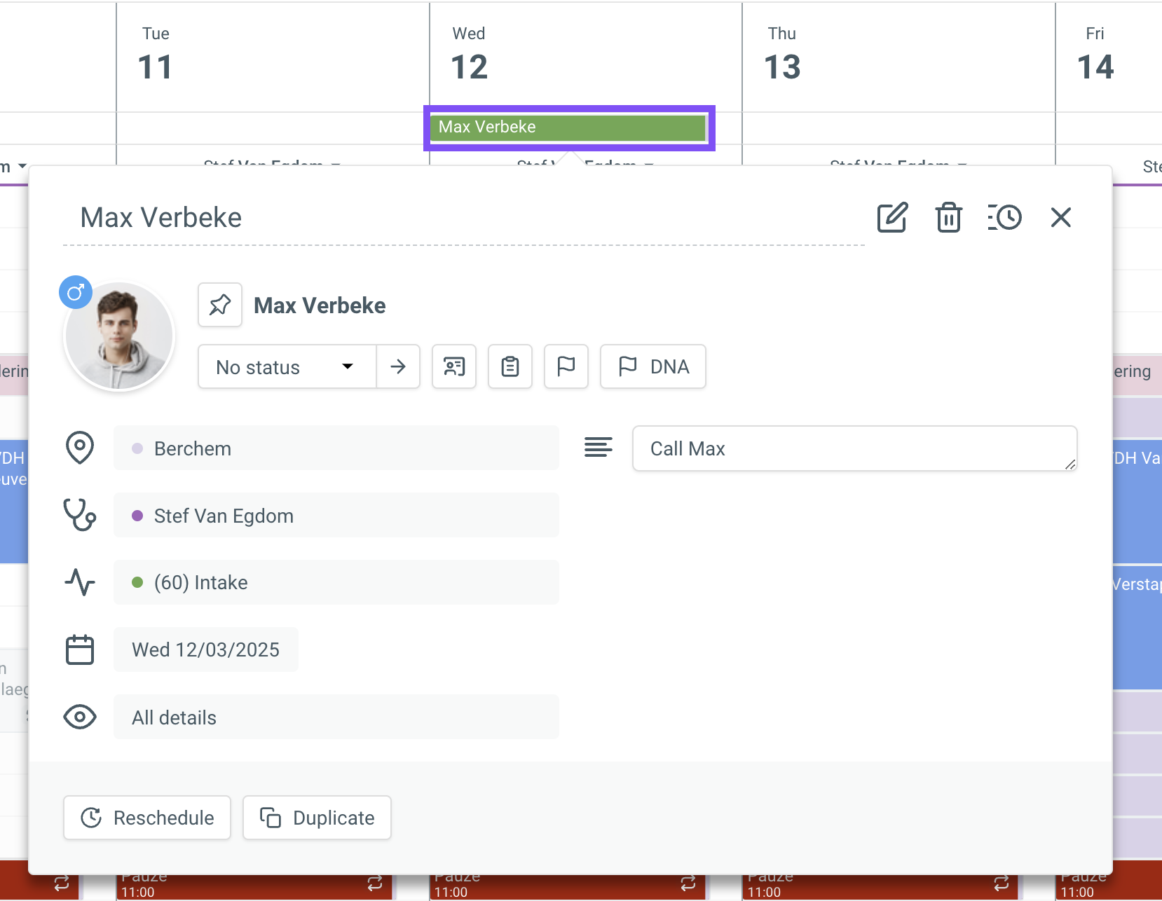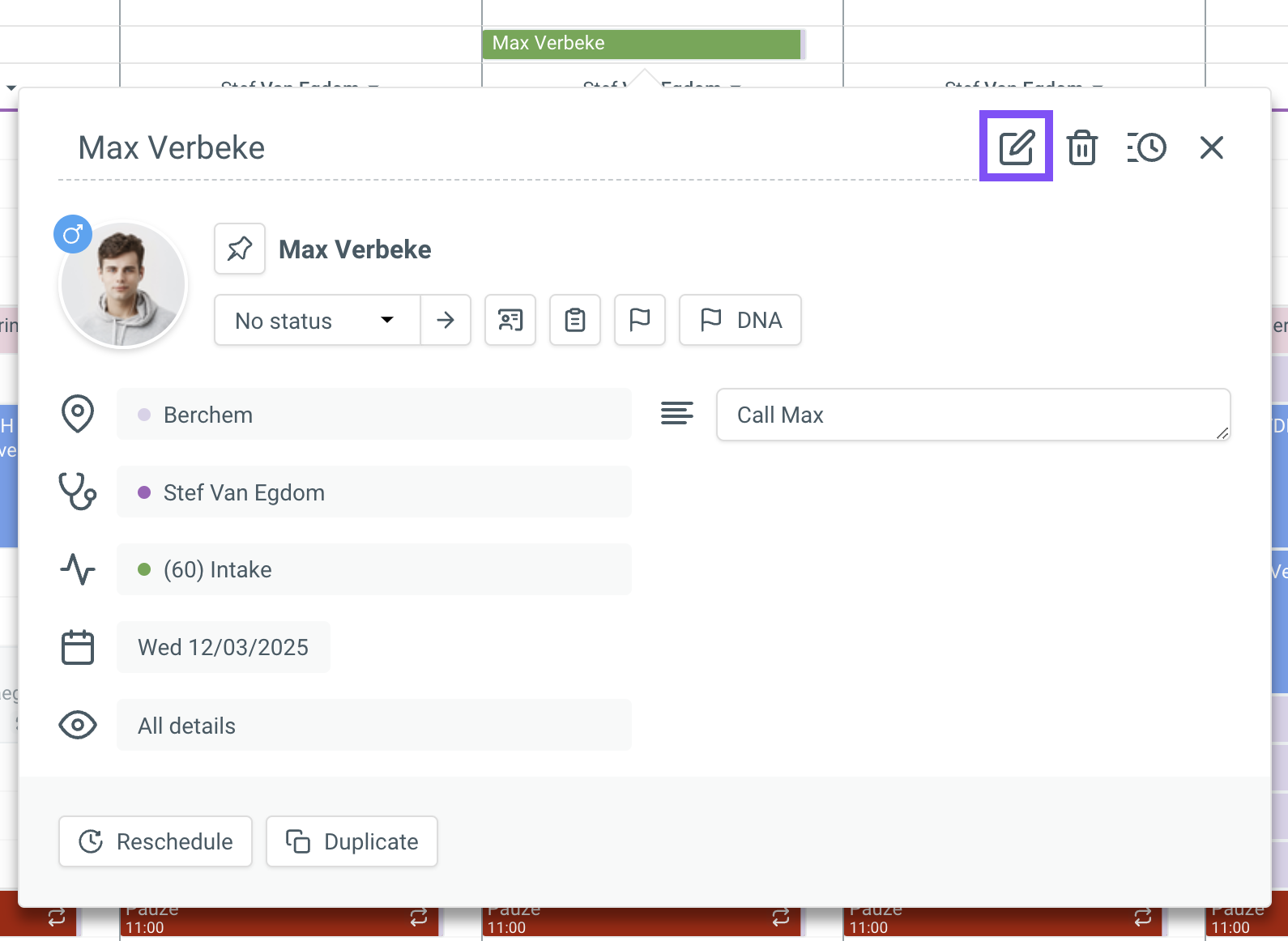 Modifying an appointment To modify an appointment, click on the appointment and then click the [Edit] button at the top of the appointment bubble. Modify the desired information such as appointment type / location / linked patient... After this, ...
