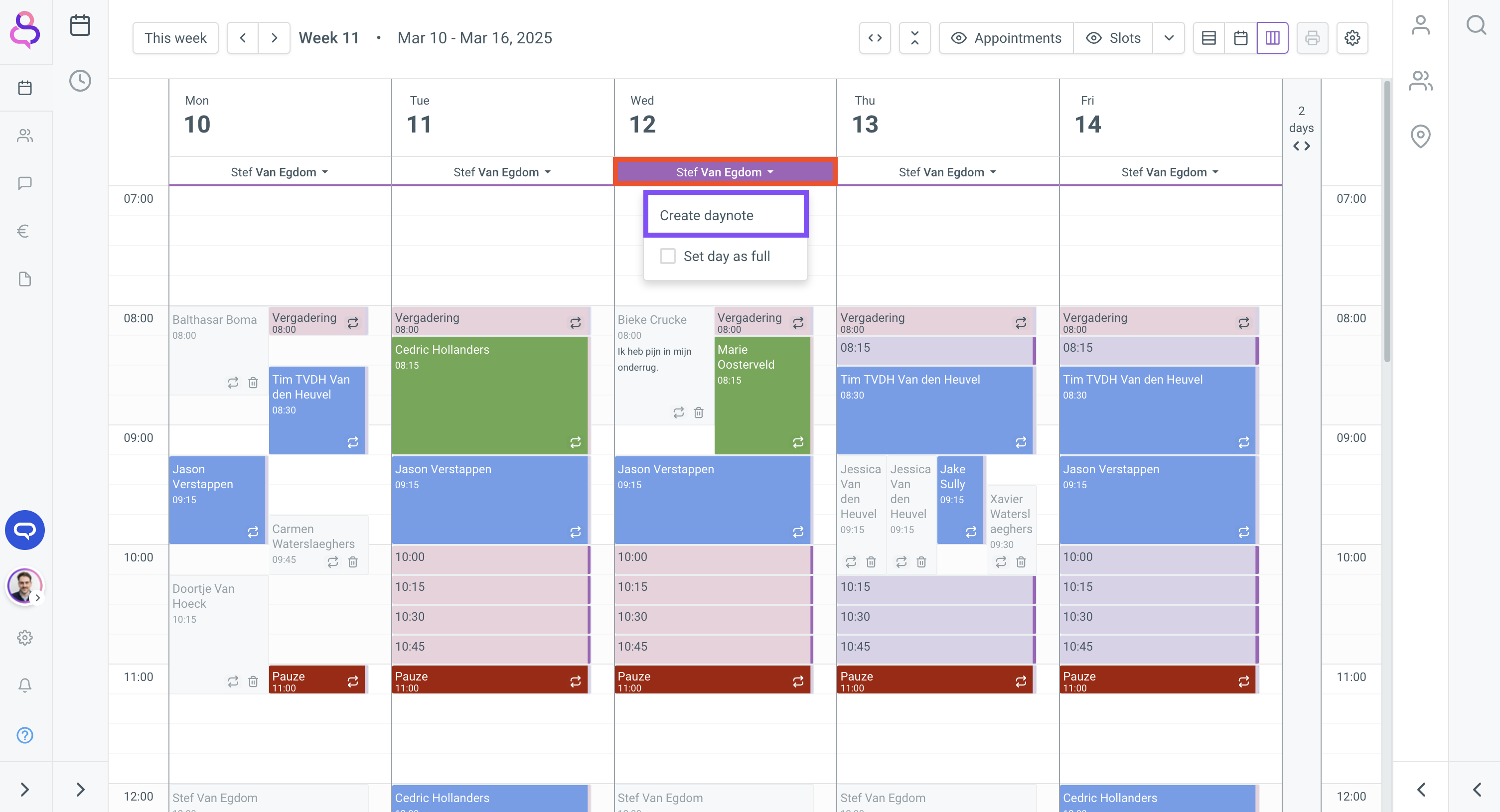 We recommend setting a work schedule in the calendar. See also: Set a work schedule Slots will then appear in the calendar. When you click on a slot, all the slot's properties are transferred into the appointment bubble, including the location, ...