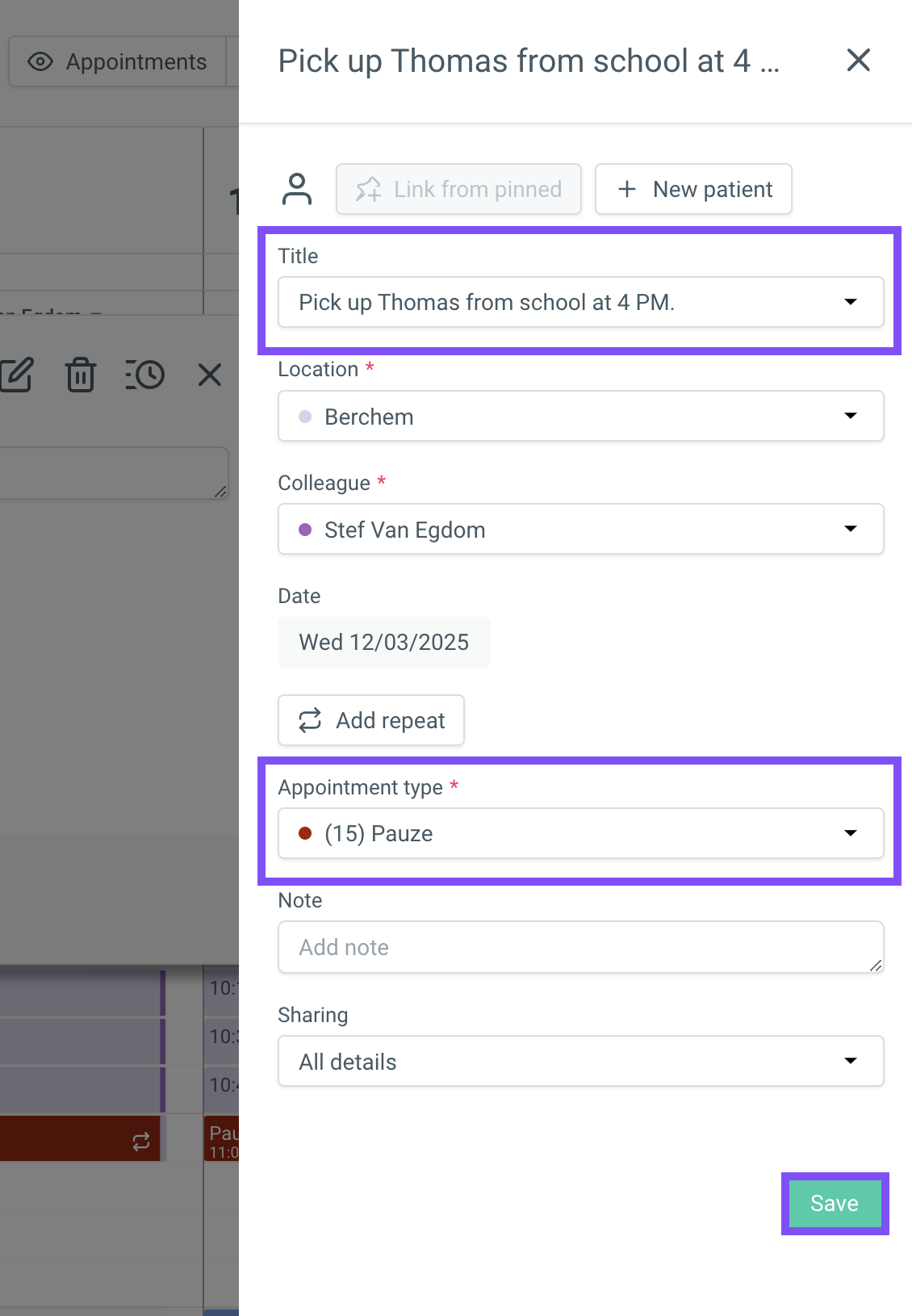 In the [Title] field, enter the note for yourself. If you want the daynote to be in a different color, select the desired color under [Appointment Type]. Finally, click the green [Save] button at the bottom.