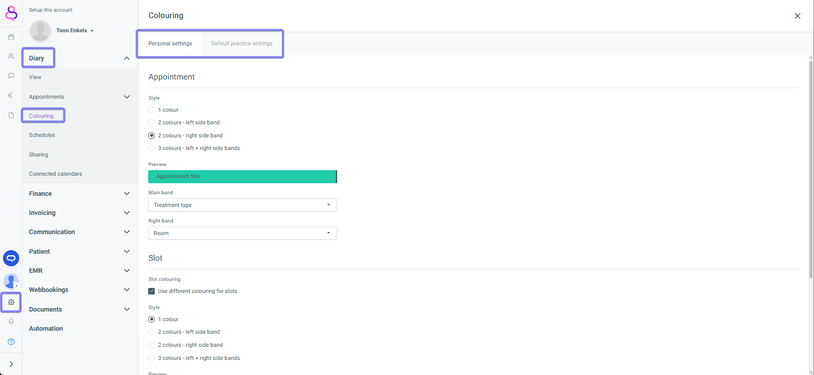 The practice settings apply to all users within the practice. However, personal settings take precedence if they have been configured.