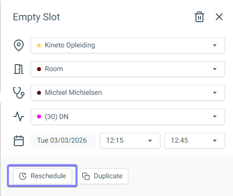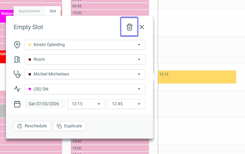 Then, at the top of the appointment pop-up, click [Slot] and select the trash bin icon to delete the slot.