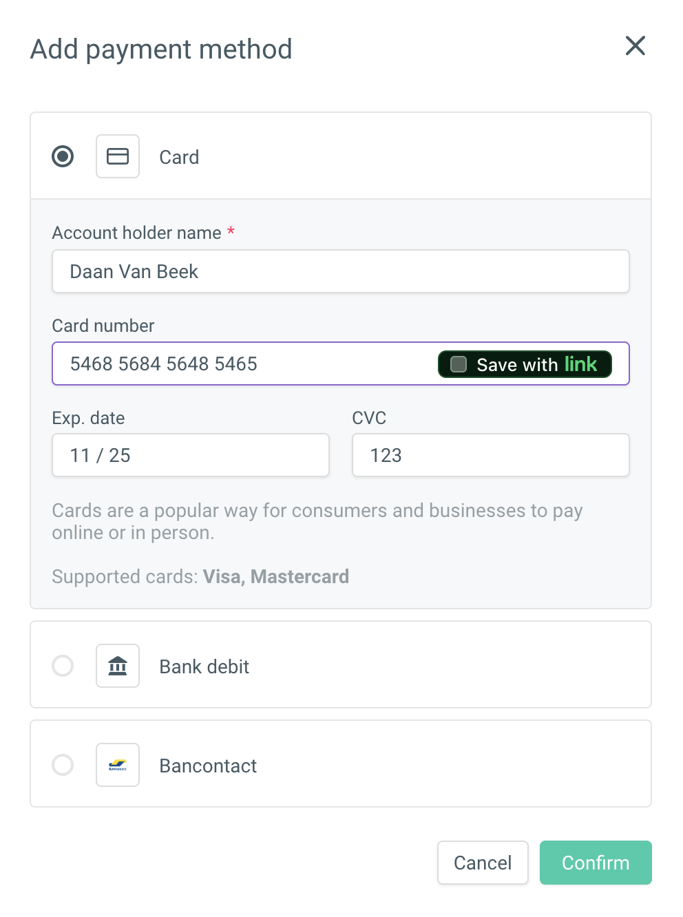 Here you'll find an overview of your saved payment methods and your default payment method.