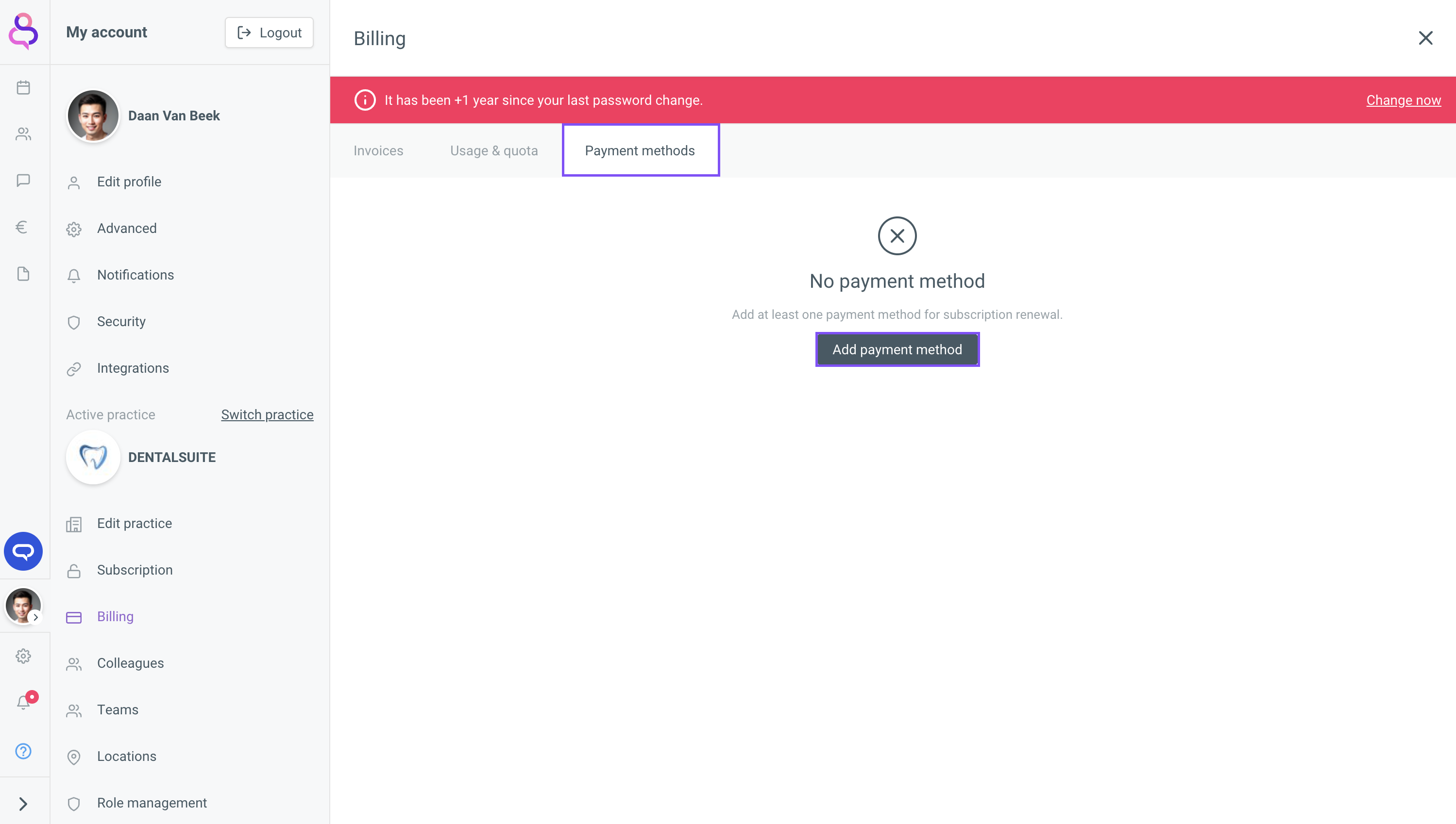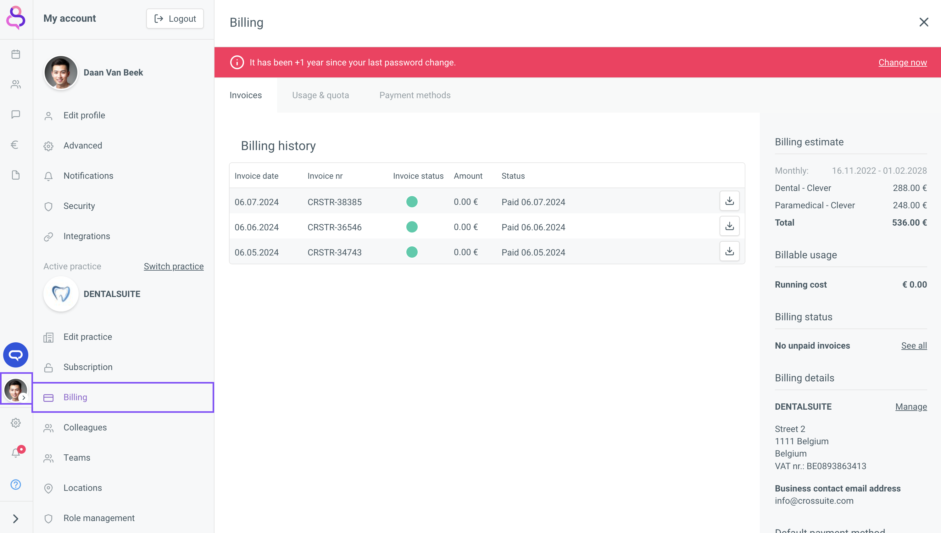- Billing status: Here you can see if the practice has any unpaid invoices with Crossuite BV.