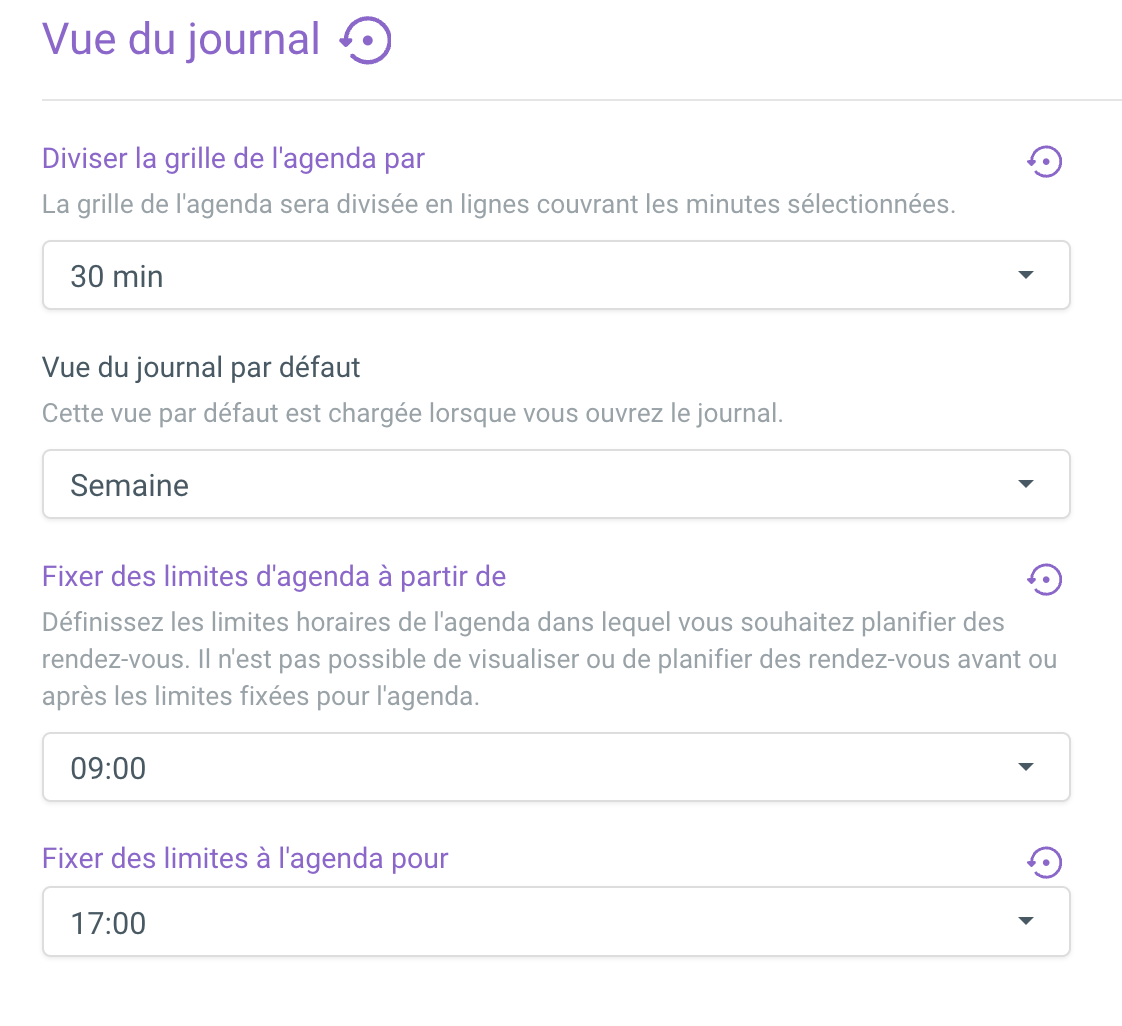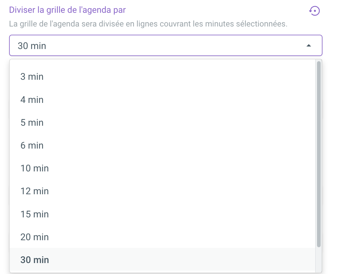 Choisissez la vue d'agenda que vous souhaitez. Il est important de tenir compte de la durée de vos types de rendez-vous. Il est préférable de prendre le plus grand diviseur commun. Par exemple, si vous avez des types de rendez-vous de 15 min et 50 min, il est préférable de choisir une division de 5 minutes.