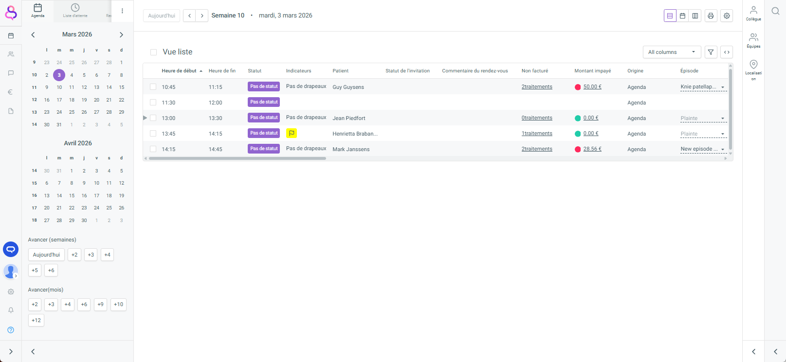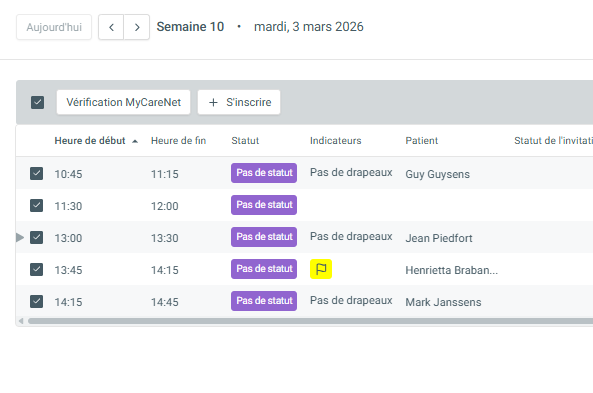 Lorsque vous sélectionnez une ou plusieurs séances, différents boutons d’action apparaissent pour vous permettre de travailler. Vous pouvez facilement y enregistrer des traitements ou vérifier l’assurabilité de votre patient via MyCareNet (Belgique).