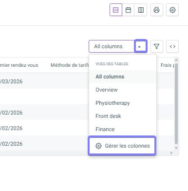Comme dans d’autres tableaux, l’affichage de la vue en liste peut être personnalisé. En haut à droite, vous trouverez un menu déroulant avec quelques vues de base déjà disponibles. Pour la vue en liste également, vous pouvez facilement créer votre propre aperçu de tableau.