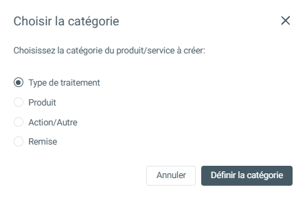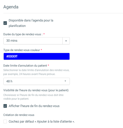 Si ce n’est pas coché, il n’est pas possible de planifier un rendez-vous pour ce type. Il reste cependant possible de l’ajouter à un traitement ou à une facture, voir également : Ajouter un élément ou un forfait à un traitement.