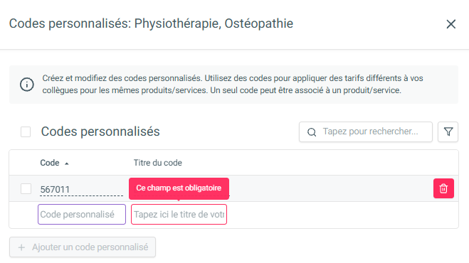 Sous Sélectionnez un code *, cliquez sur la barre pour choisir un code, puis cliquez à droite sur [Codes personnalisés] pour ajouter un nouveau code.