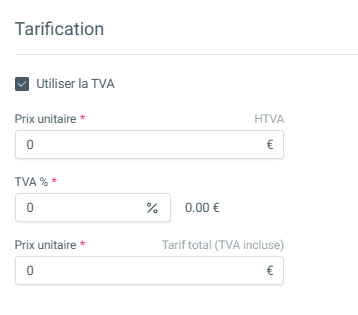 Définissez ici le tarif. Cochez l’option TVA si applicable.