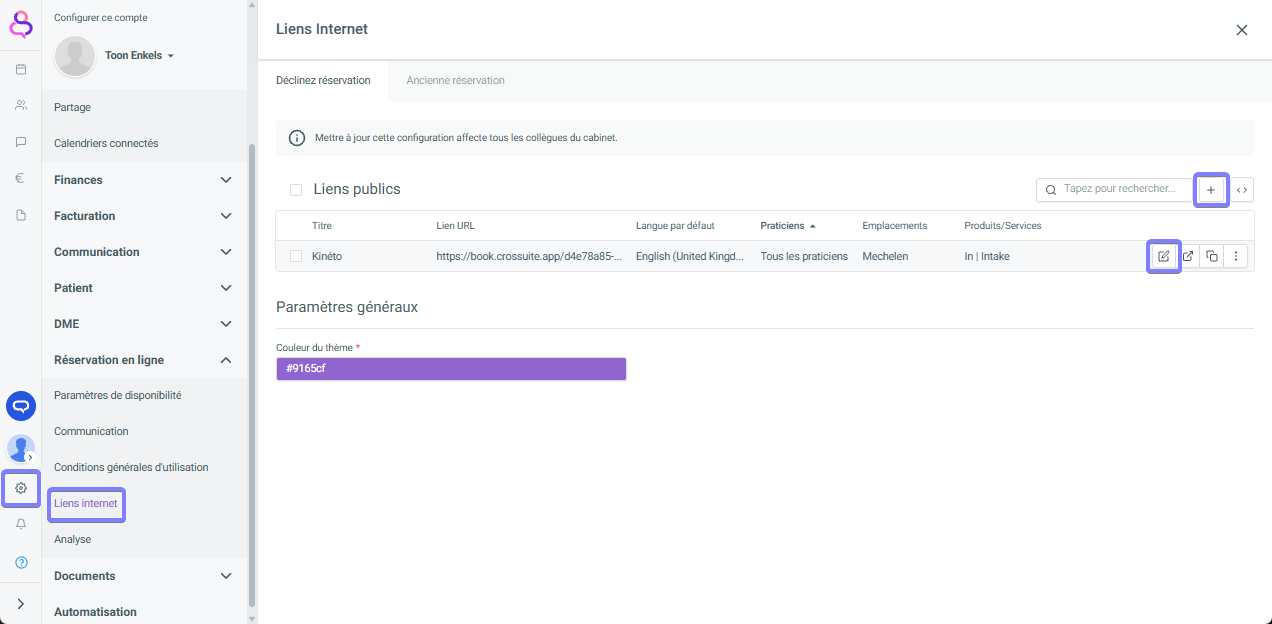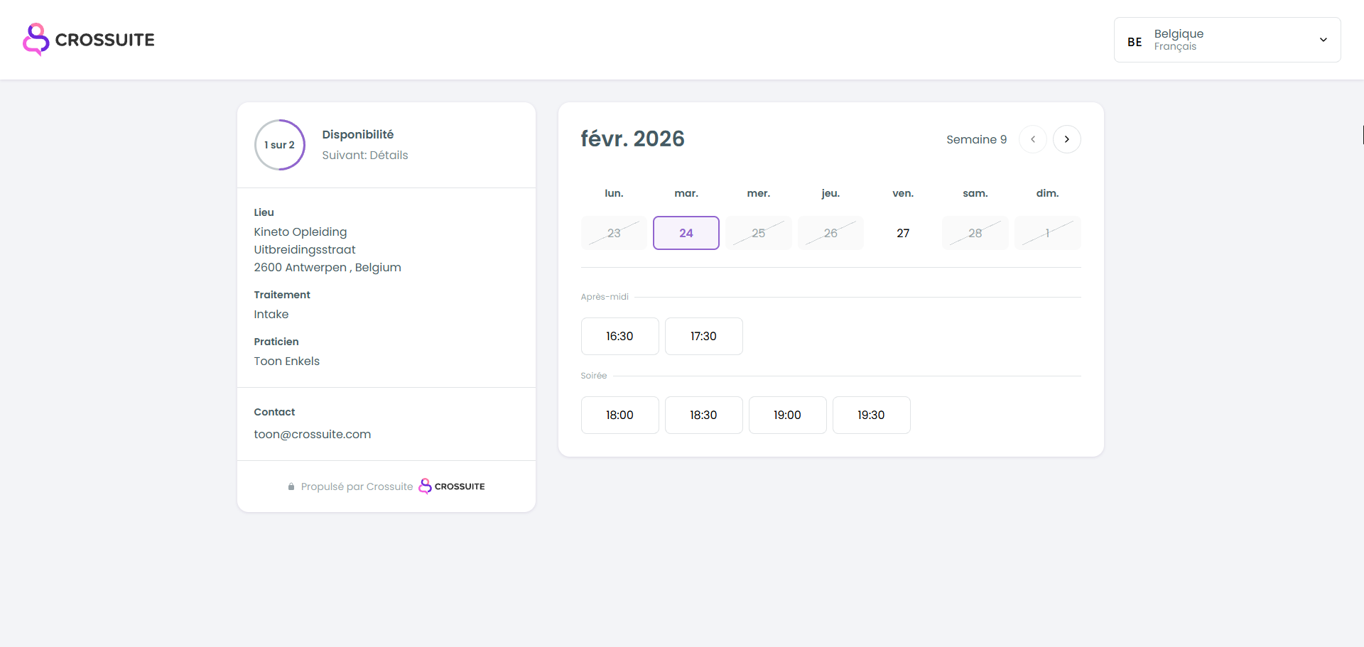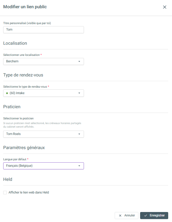 - Langue par défaut : Choisissez la langue dans laquelle l’interface de réservation est affichée. Les patients peuvent encore la modifier eux-mêmes si souhaité.