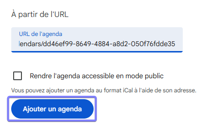 Collez le lien copié dans la fenêtre URL et cliquez sur [Ajouter l’agenda].