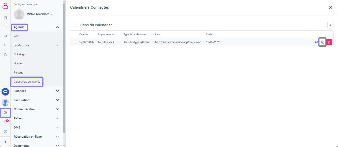 Créer un lien pour synchroniser le calendrier Grâce à un lien que vous insérez dans votre calendrier personnel, tous les rendez-vous sont synchronisés de Crossuite vers votre calendrier personnel. Accédez à [Paramètres] > [Rendez-vous] > [Calendriers ...