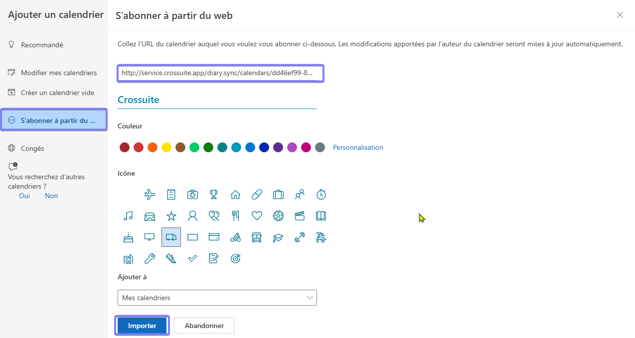 Récupérer le lien créé dans Crossuite Pour créer un nouveau lien, suivez les étapes décrites dans l’article suivant : Lier le calendrier Crossuite à une application de calendrier externe. Allez dans [Paramètres] > [Agenda] > [Calendriers connectés]. ...