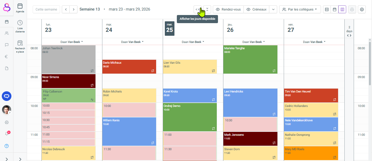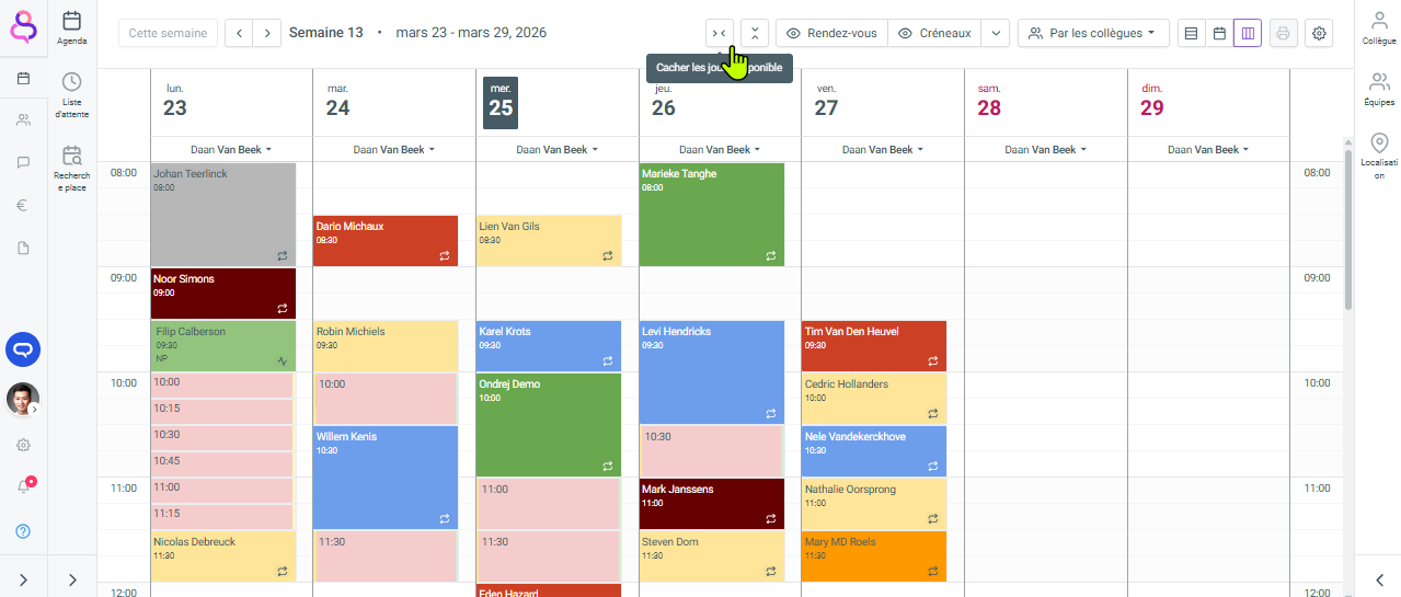Les jours inactifs sont des jours qui ne contiennent aucun rendez-vous et ne disposent d’aucun créneau disponible, et sont donc complètement vides. Il est possible de masquer ces jours dans le calendrier afin de conserver une vue d’ensemble claire.