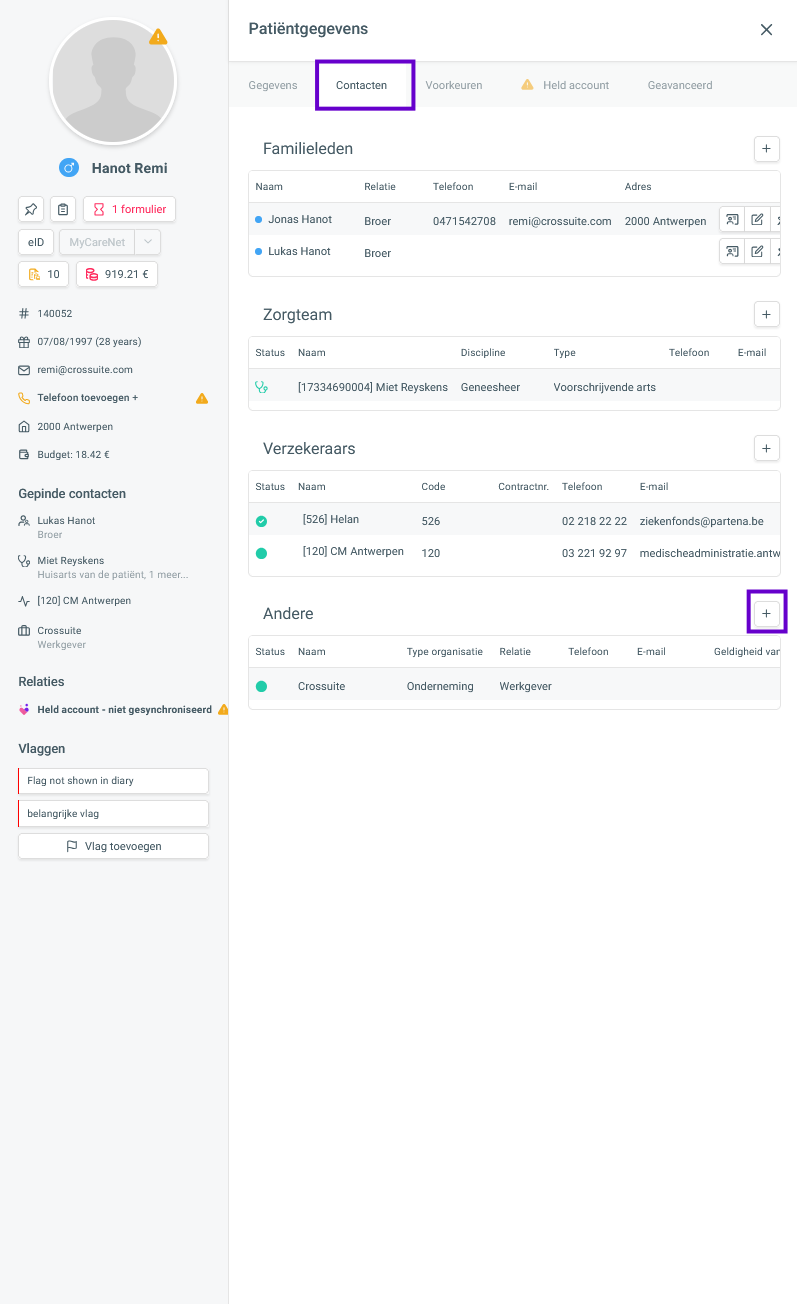 Als je patiënt nog geen bedrijfscontact heeft kan je dit aanmaken via patiëntdetails > contacten bij [Andere]