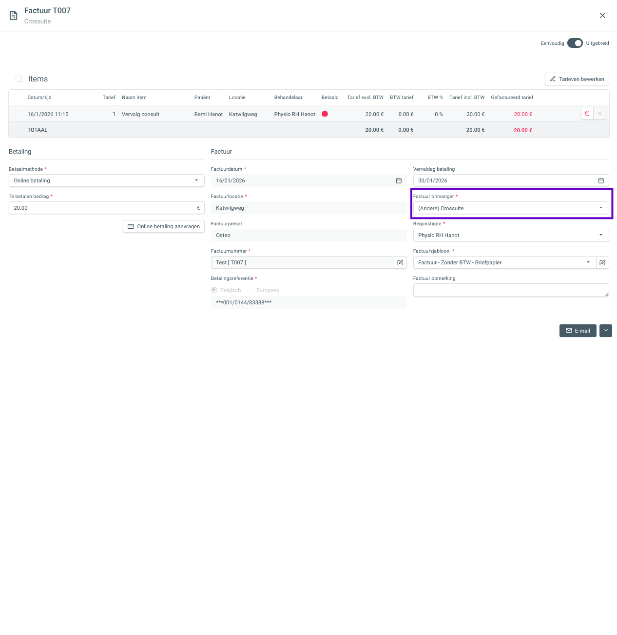 Op deze manier stel je een standaard mailsjabloon voor het verzenden van facturen en online betaalverzoeken in. Deze instelling beïnvloedt alle collega's in de praktijk. Zie ook: Mollie - Online betalingen activeren Ga via [Instellingen] > ...