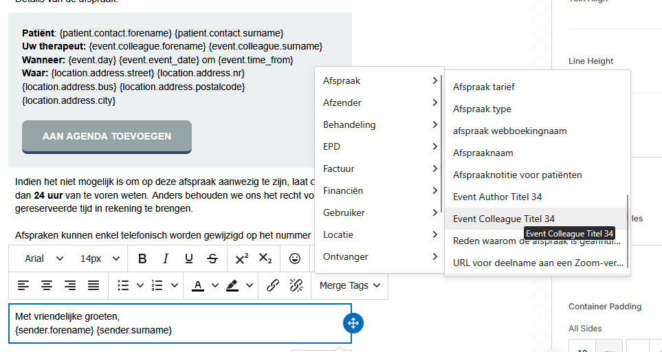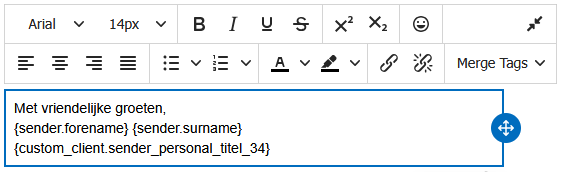 Het instellen van dit autoveld hangt af van het sjabloon waar je dit wenst toe te voegen. In dit artikel wordt het toevoegen van een autoveld bij het mailsjabloon weergegeven, de volgende artikels leggen het gebruik van de editor bij verschillende sjablonen uit: