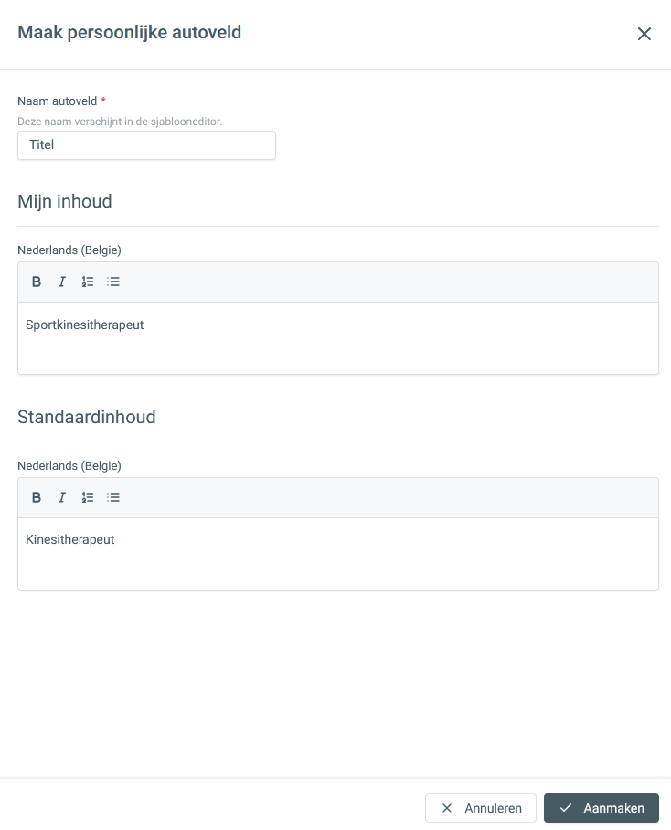 Voer hier de naam van het autoveld in, dit wordt in de sjablooneditor weergegeven. Vul dan per taal de inhoud in. Klik rechtsonder op [Aanmaken] om dit in te stellen.