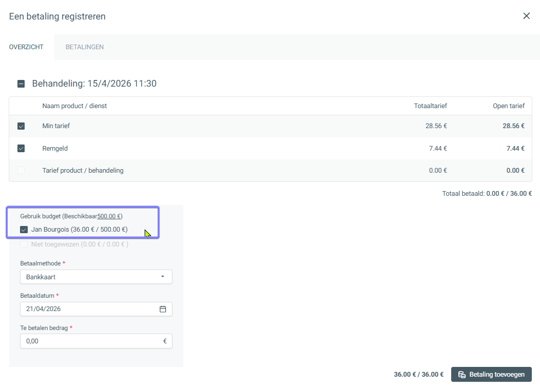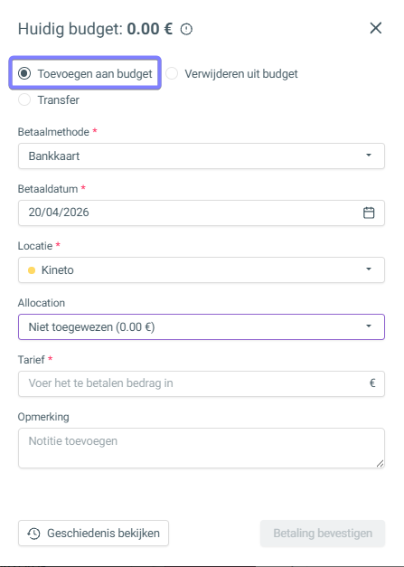 Duid bovenaan [Toevoegen aan budget] aan en kies de betaalmethode, de betaaldatum en de locatie. Kies aan welke behandelaar het bedrag toegewezen dient te worden. Vul het tarief in en voeg een nota toe indien toepasselijk en bevestig de betaling. Het toevoegen van het budget bedrag wordt rechtsonder bevestigd.