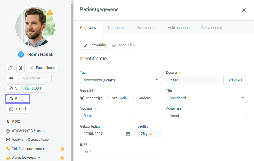 Ga naar de patiëntgegevens en klik links op [Budget].