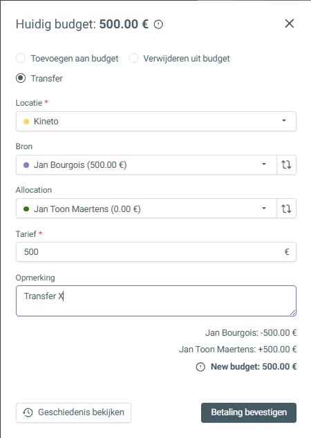 Duid bovenaan [Transfer] aan en kies de locatie en de bron. Kies naar wie of waar het bedrag getransfereerd dient te worden. Vul het tarief in en voeg eventueel een nota toe indien toepasselijk en bevestig de transfer.