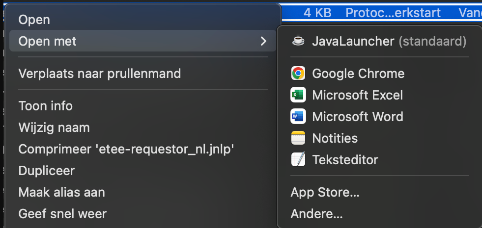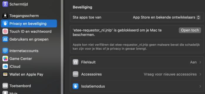 Bij Apple computers is het mogelijk dat dit bestand als onveilig wordt beschouwd en wordt geblokkeerd. In dit geval ga je via de Finder naar de Downloads folder. Hier rechter klik je het bestand om 'openen met > Java Launcher' te selecteren. Duid hier aan dat het bestand geopend mag worden. Open Systeeminstellingen en ga naar Privacy en Beveiliging. Klik hier bij het bestand op 'open toch' om dit toe te laten.
