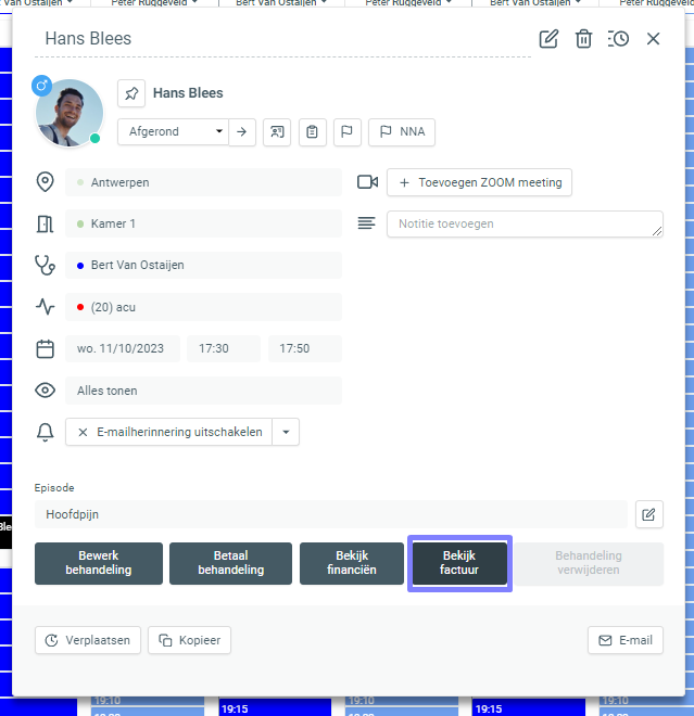 Indien je gebruik maakt van de agenda, dan is het ook mogelijk om de factuur te openen via de afspraakballon. Klik op een afspraak in de agenda en klik vervolgens op [Bekijk factuur] om het facturatiescherm te openen.