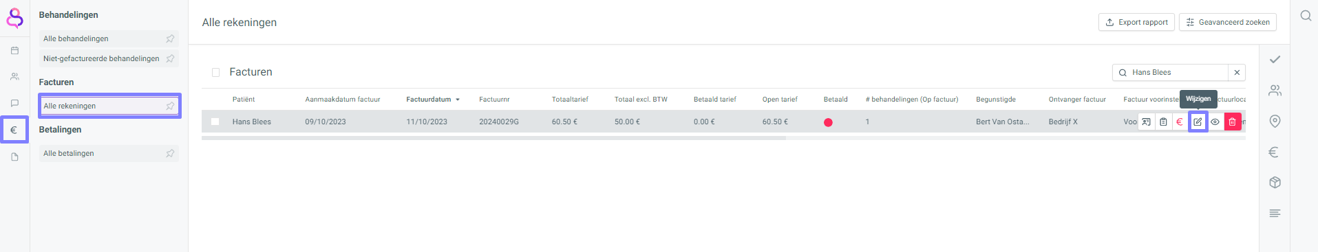 Een andere optie is om de factuur rechtstreeks te bewerken vanuit het patiëntbestand. Open het patiëntbestand en ga naar [Financiën]. Ga met je muis over een factuur en klik op [Wijzigen].
