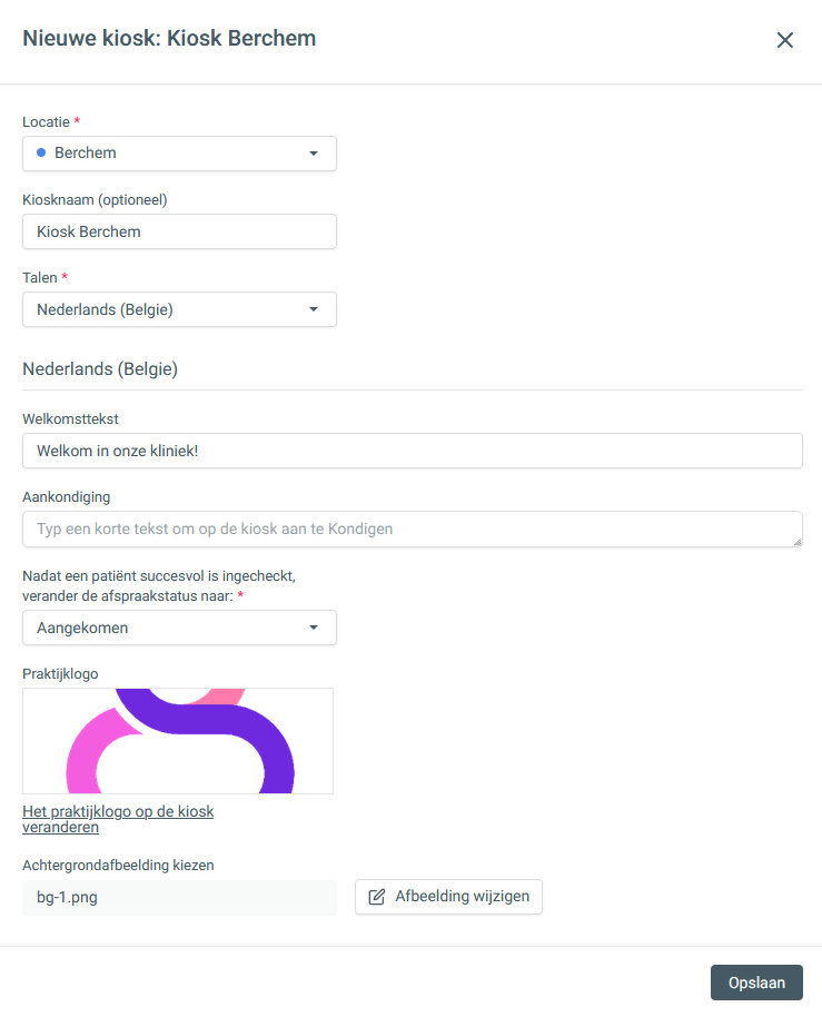 Klik op [Afbeelding wijzigen] om de achtergrondafbeelding voor de kiosk aan te passen. Sla de wijzigingen rechtsonder op om de nieuwe kiosk toe te voegen.