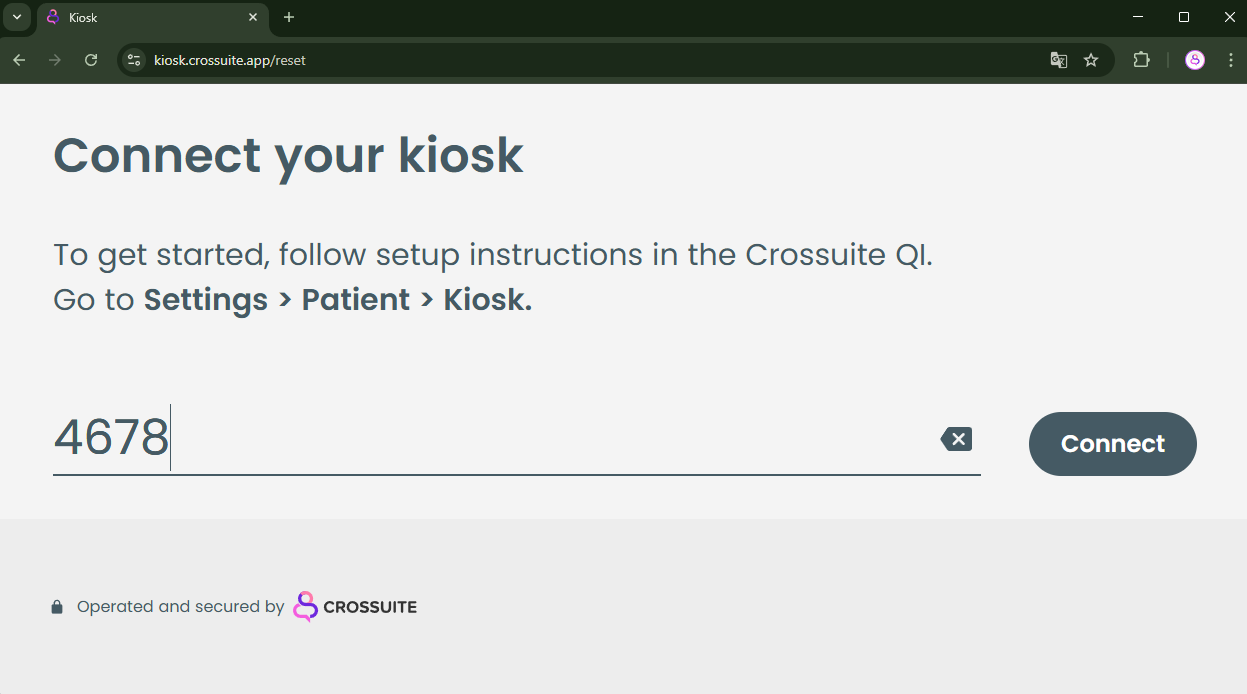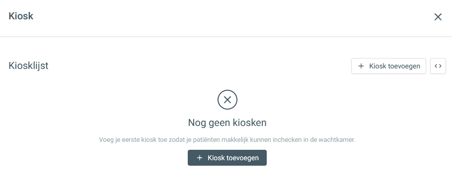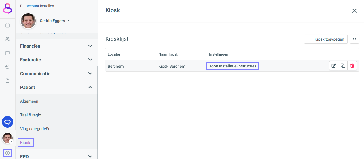 Ga naar Instellingen > Patiënt > Kiosk. Klik bij de juiste kiosk op [Toon installatie-instructies] om de activeringscode weer te geven.