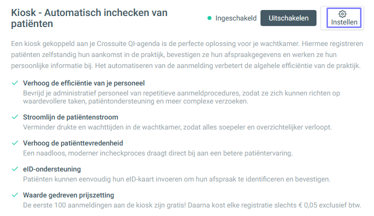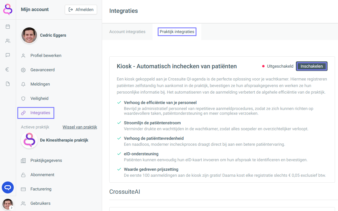Ga naar Mijn Account > [Integraties] > [Praktijk integraties]. Klik bij Kiosk op [Inschakelen].