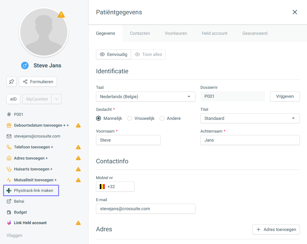 Ga naar de patiëntgegevens. Klik links bij de patiëntgegevens op [Physitrack-link maken] om dit patiëntdossier met Physitrack te koppelen. Eens gekoppeld klik je hier op [Open Physitrack] om de patiënt in Physitrack te openen.